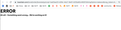 We've always had "Toast Takeout App" turned on in our back-end, so not sure why our "Toast Local" button is directing to the error page that was pictured. No matter how many times I refresh, nothing happens.