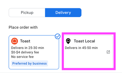 However, ours is also now showing a "Toast Local" option. Does anybody know what this is? We use our own in-house drivers (the option on the left), but I cannot find any articles about what "Toast Local" actually is. It is showing up under both Delivery AND Pickup on our Google page.