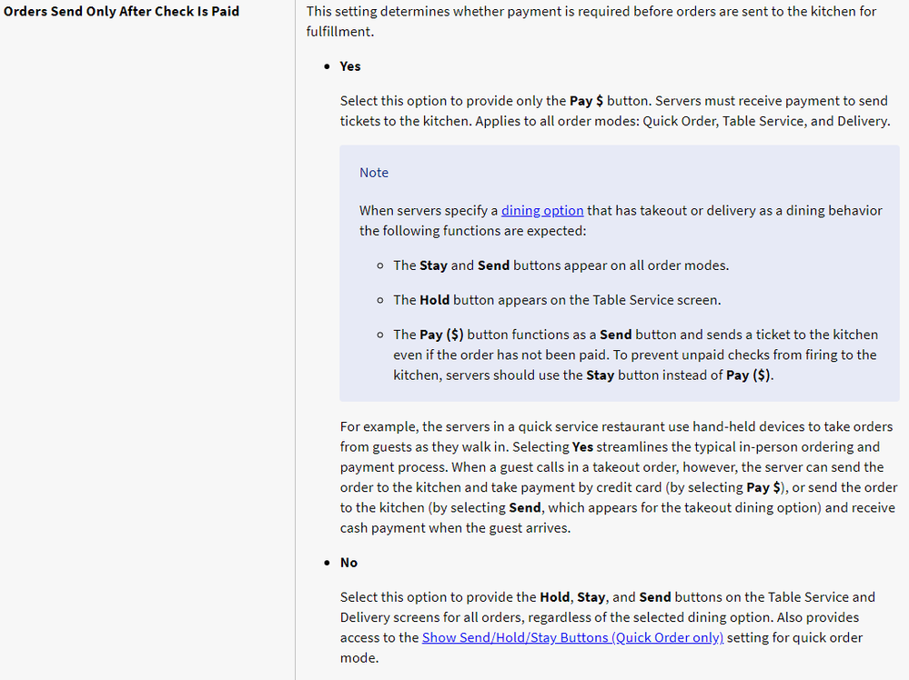 I believe you may need to reach out to one of the Toast agent and ask about it. The "Send Order After An Order Is Paid" feature did not work at all when we first launched. I brought this up Toast. After several months (not sure how long it had been), there was an update and voila it works now.